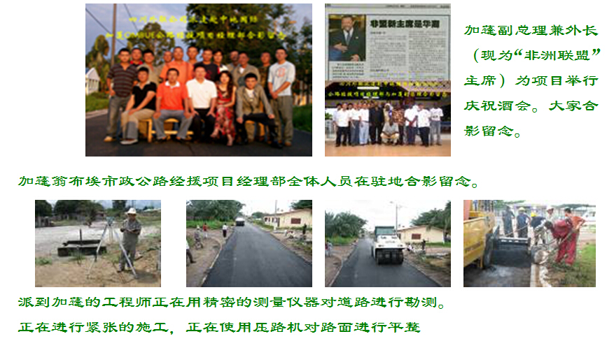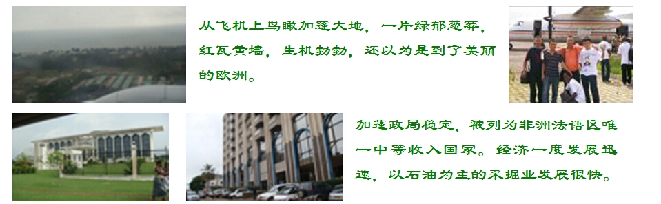 從飛機(jī)上鳥瞰加蓬大地,一片綠郁蔥莽,紅瓦黃墻,生機(jī)勃勃,還以為是到了美麗的歐洲。加蓬政局穩(wěn)定,被列為非洲法語區(qū)唯一中等收入國家。經(jīng)濟(jì)一度發(fā)展迅速,以石油為主的采掘業(yè)發(fā)展很快。加蓬年平均氣溫26℃,擁有豐富的森林資源,森林面積占全國土地面積的85%,被譽(yù)為非洲的“綠金之國”。加蓬的氣候很適宜植物的生長,美麗的出產(chǎn)的蔬菜瓜果品種繁多,真稱得上花朵,絢麗而多姿。加蓬副總理兼外長(現(xiàn)為“非洲聯(lián)盟”主席)為項(xiàng)目舉行慶祝酒會(huì)。大家合影留念。加蓬翁布埃市政公路經(jīng)援項(xiàng)目經(jīng)理部全體人員在駐地合影留念。派到加蓬的工程師正在用精密的測(cè)量?jī)x器對(duì)道路進(jìn)行勘測(cè)。正在進(jìn)行緊張的施工,正在使用壓路機(jī)對(duì)路面進(jìn)行平整站在自己修建的馬路上,別有一翻滋味在海邊一處施工工地現(xiàn)場(chǎng)。