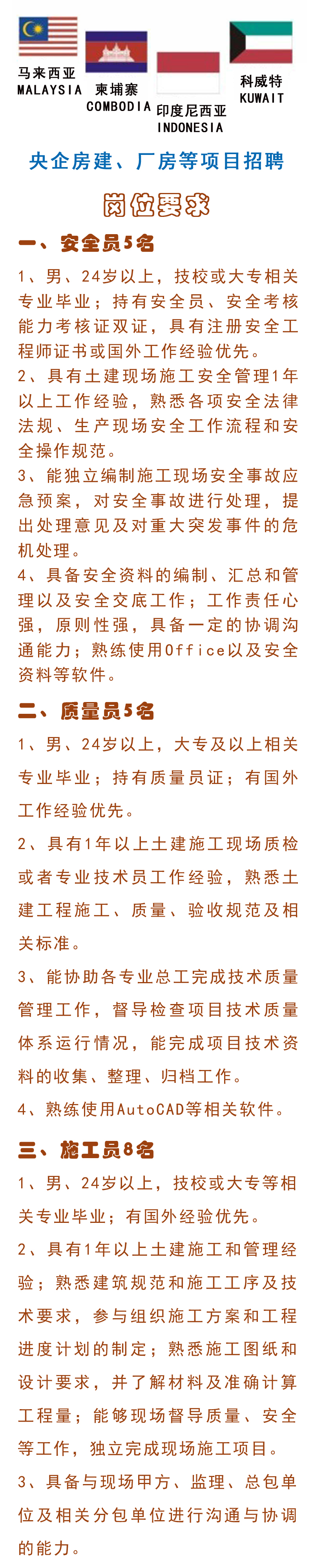 越南、柬埔寨、科威特、馬來西亞、印度尼西亞央企房建、廠房等項目招聘45人